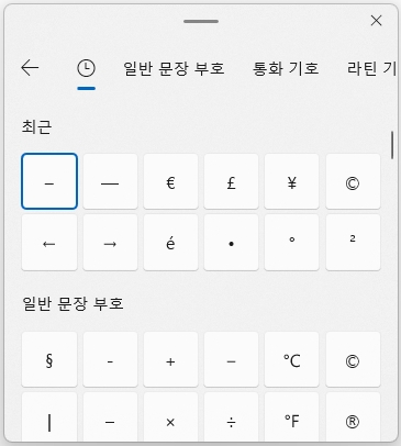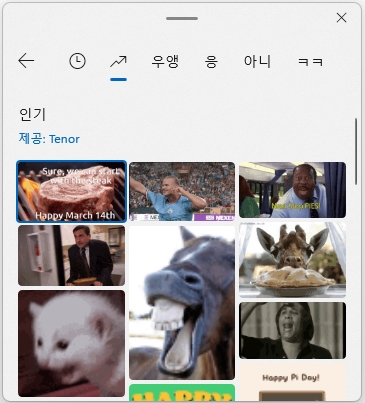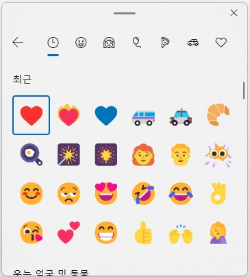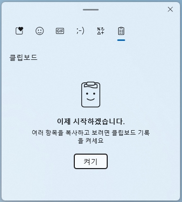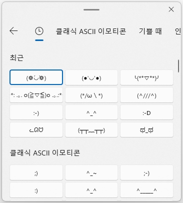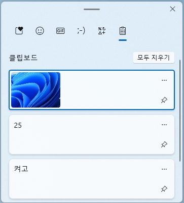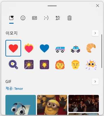 이 창은 클립보드 관리 용도 외에도 이모지, 움직이는 GIF, Kaomoji, 기호등을 바로 삽입하는 기능도 포함되어 있다. 서로 관계가 있나 싶기도 하고 이모티콘 관련해서는 『 윈도우키 + . 』을 눌러서 나오는 이모지 기능도 있었는데 이것과 통합시켜 버린 창이다. 윈도우10에서는 서로 다른 창이 뜨는데 윈도우 11에서는 같은 창을 띄우는데 윈도우키 + V를 누르면 클립보드가 활성화되서 뜨고, 윈도우키 + .을 누르면 이모지가 활성화되서 뜬다. 아래 그림들을 확인하자.