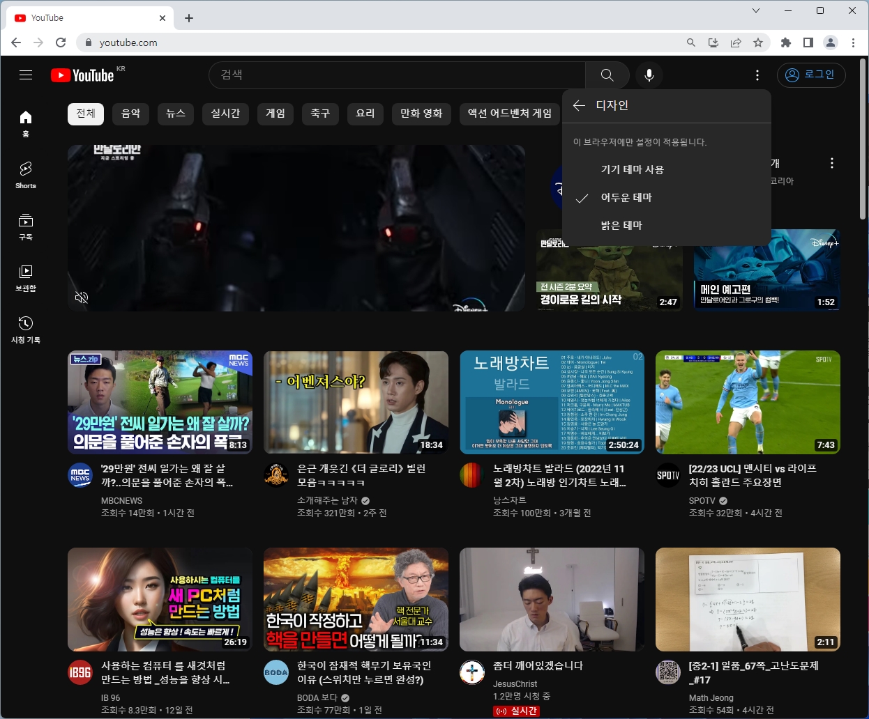 그래서 그런가? 유튜브는 자체적으로 다크모드를 지원한다. 윈도우의 설정을 뭐로 했든 유튜브만 다크모드로 하려면 유튜브에서 설정하자. 유튜브의 [설정 > 디자인 > 어두운 테마]를 선택하면 유튜브 화면만 다크모드로 변경된다.