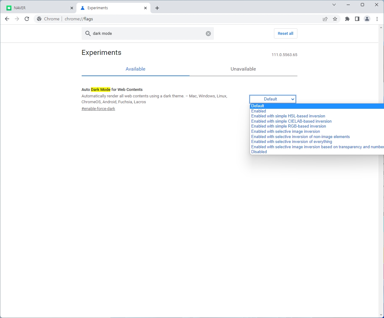 이 기능은 알려진 바에 의하면 아직 테스트중인 기능이라고 한다. 그러니 사용하실 분들만 사용하시면 되겠다. 이 기능도 크롬이 자체적으로 지원하는 기능이기 때문에 윈도우 다크모드와는 관련이 없다. 아래 그림을 보자.