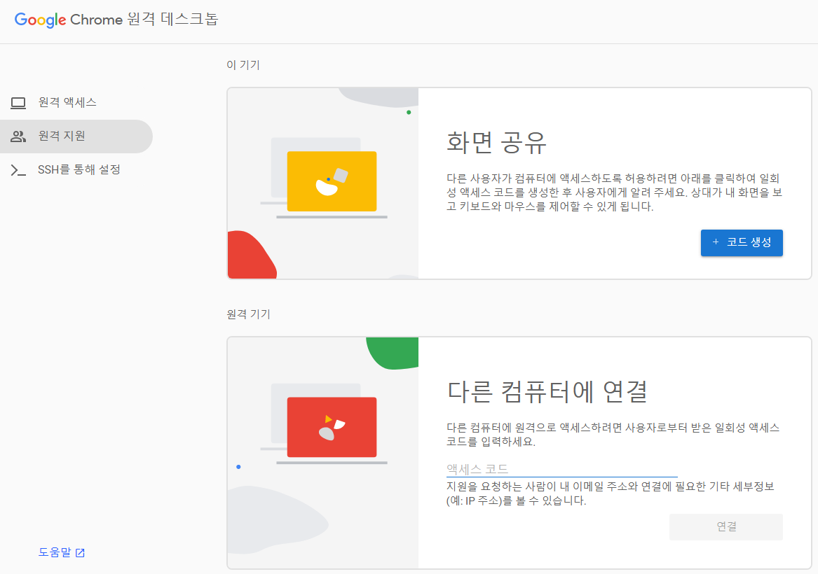 이 링크를 눌러서 크롬 원격 지원 화면으로 이동 - 구글 아이디로 로그인 하세요.